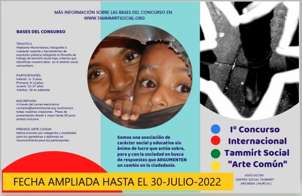 El Primer Concurso Internacinal Tammirt Social "Arte común" amplia su plazo de presentación hasta el 30 de julio de 2022. ¿Aún no has participado? ¡Aquí encuentras las bases del Primer Concurso Internacional Tammirt Social "Arte Común"!